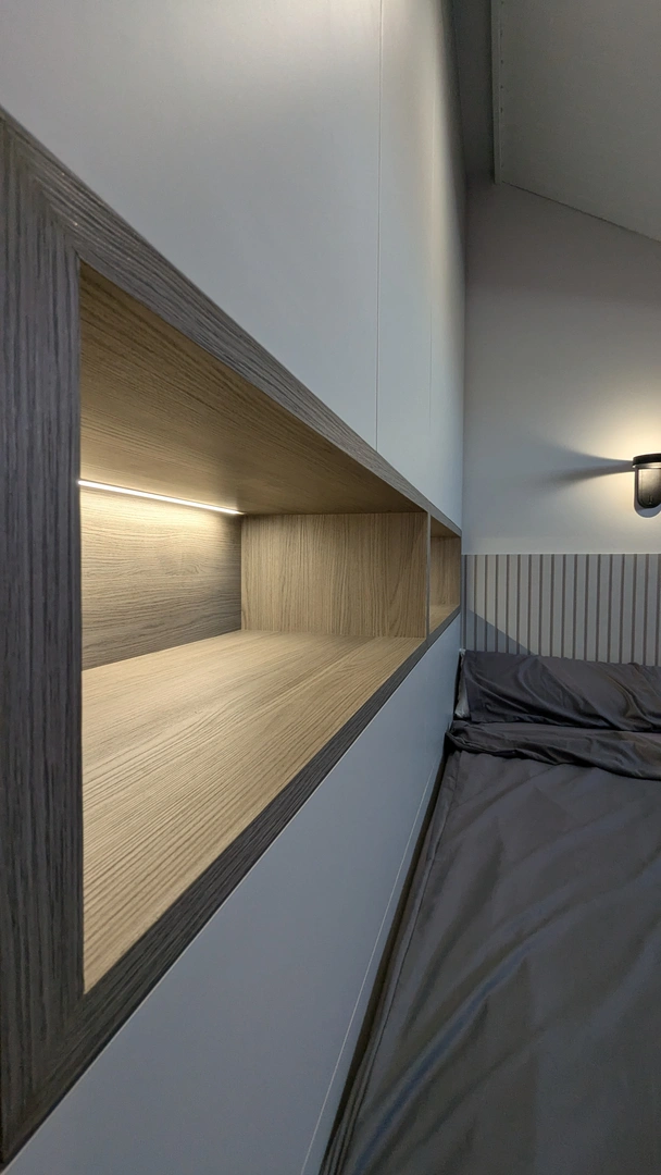 El resultado de aplicar nuestro Interiorismo Constructivo, es un espacio que convierte el desafío de la buhardilla en una solución de diseño, práctica y estética. Conseguimos un ambiente perfectamente adaptado a las necesidades juveniles, donde la funcionalidad del estudio y el confort del descanso coexisten en perfecta armonía.