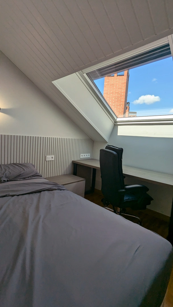 En Ferlosa, nos centramos en la distribución del espacio basado en un diseño multiusos ,definiendo la zona de estudio con un amplio escritorio situado justo bajo la ventana de tejado, lo que nos permite asegurar que se aproveche la mejor luz natural. La cama individual, por su parte, queda perfectamente integrada junto a un cabecero que también resulta ser funcional.